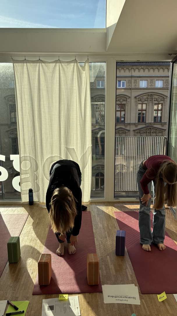 Im Anschluss begann die Yoga-Praxis. Wir lernten verschiedene Variationen des Sonnengrußes kennen, die ruhig und verständlich angeleitet wurden. Der Raum war von natürlichem Tageslicht durchflutet, was die Praxis besonders angenehm machte. Währenddessen standen uns jederzeit Hilfsmittel wie Kissen und Decken zur Verfügung. Den praktischen Teil schloss eine kurze Endentspannung ab.