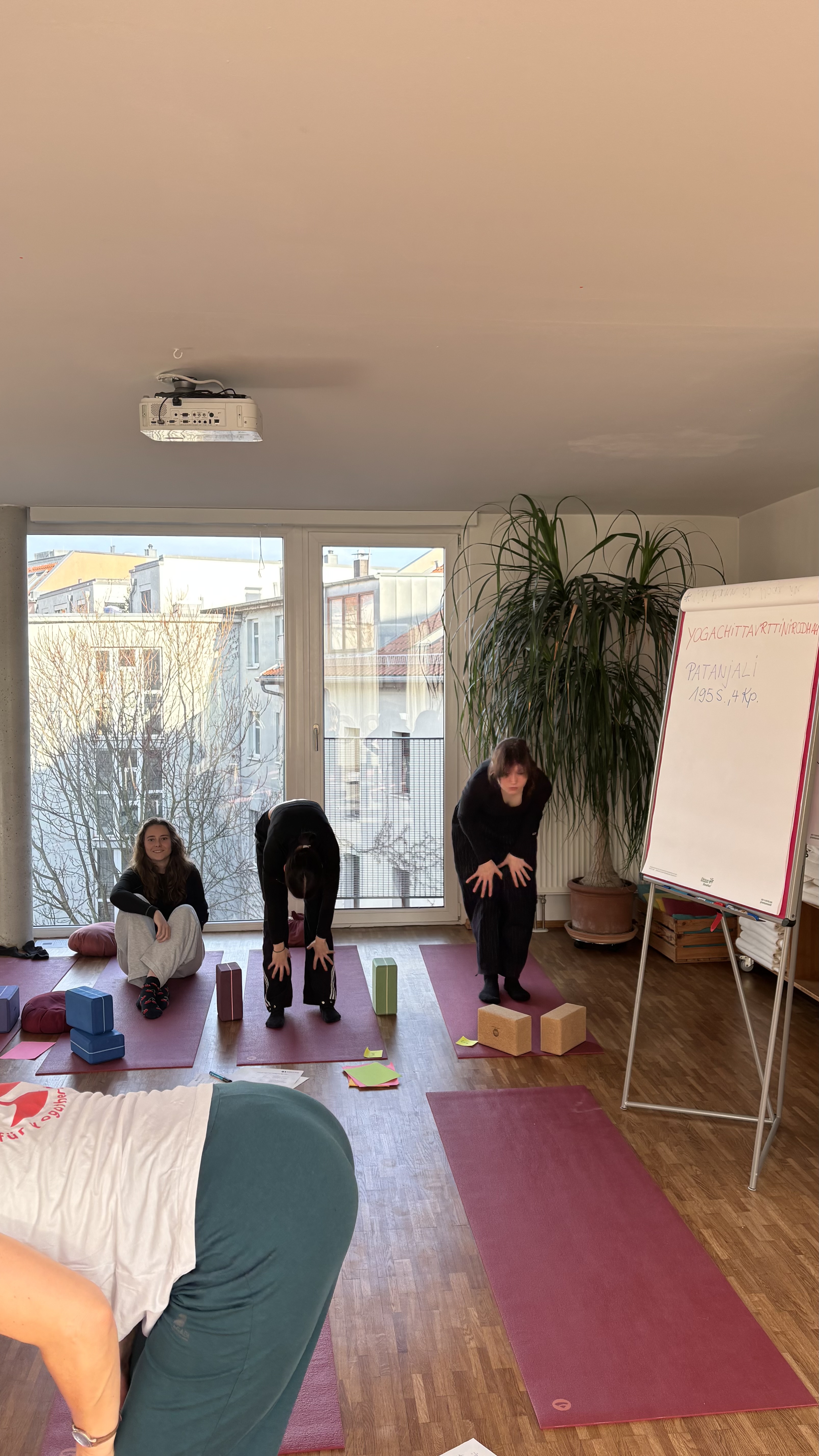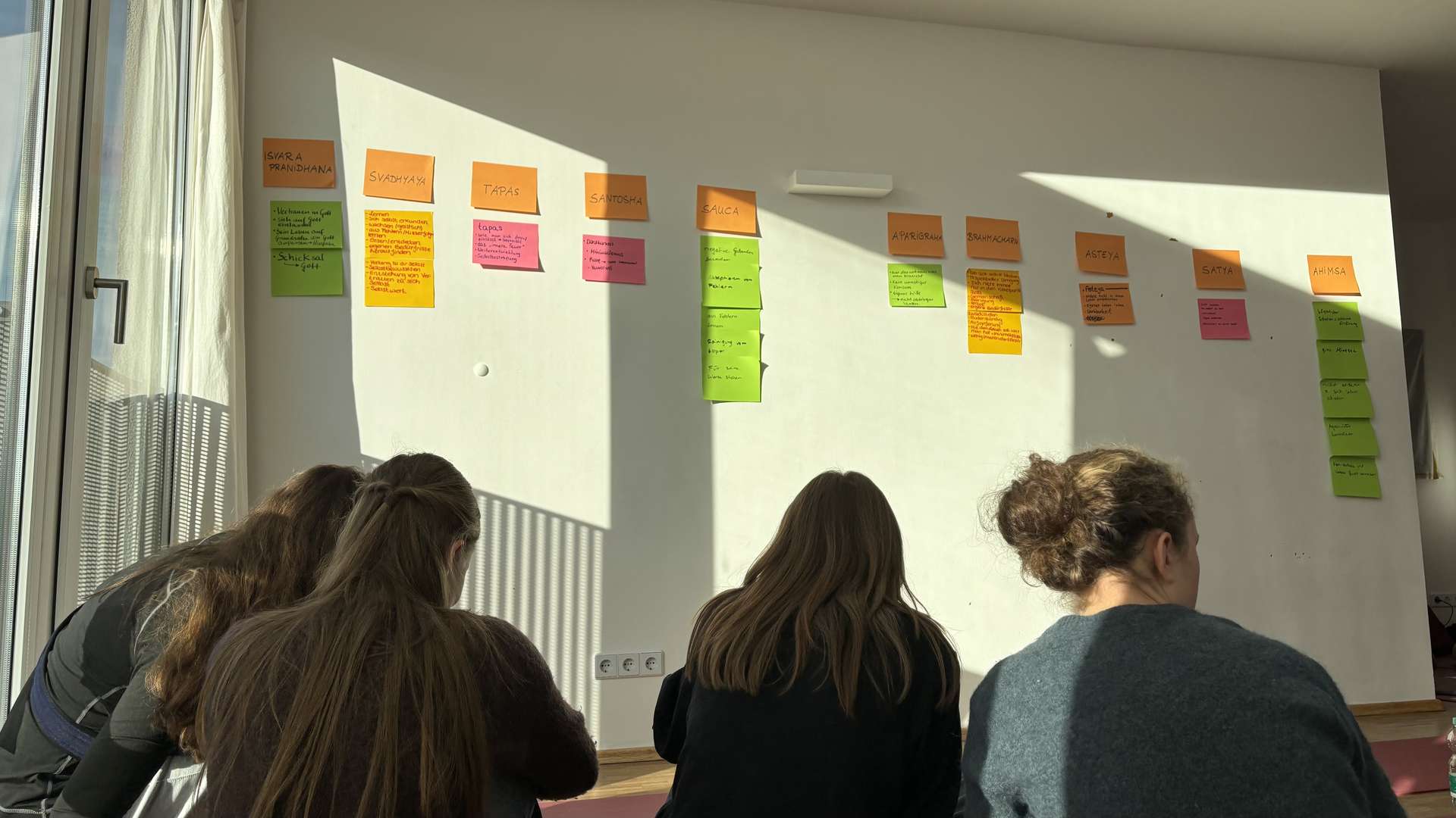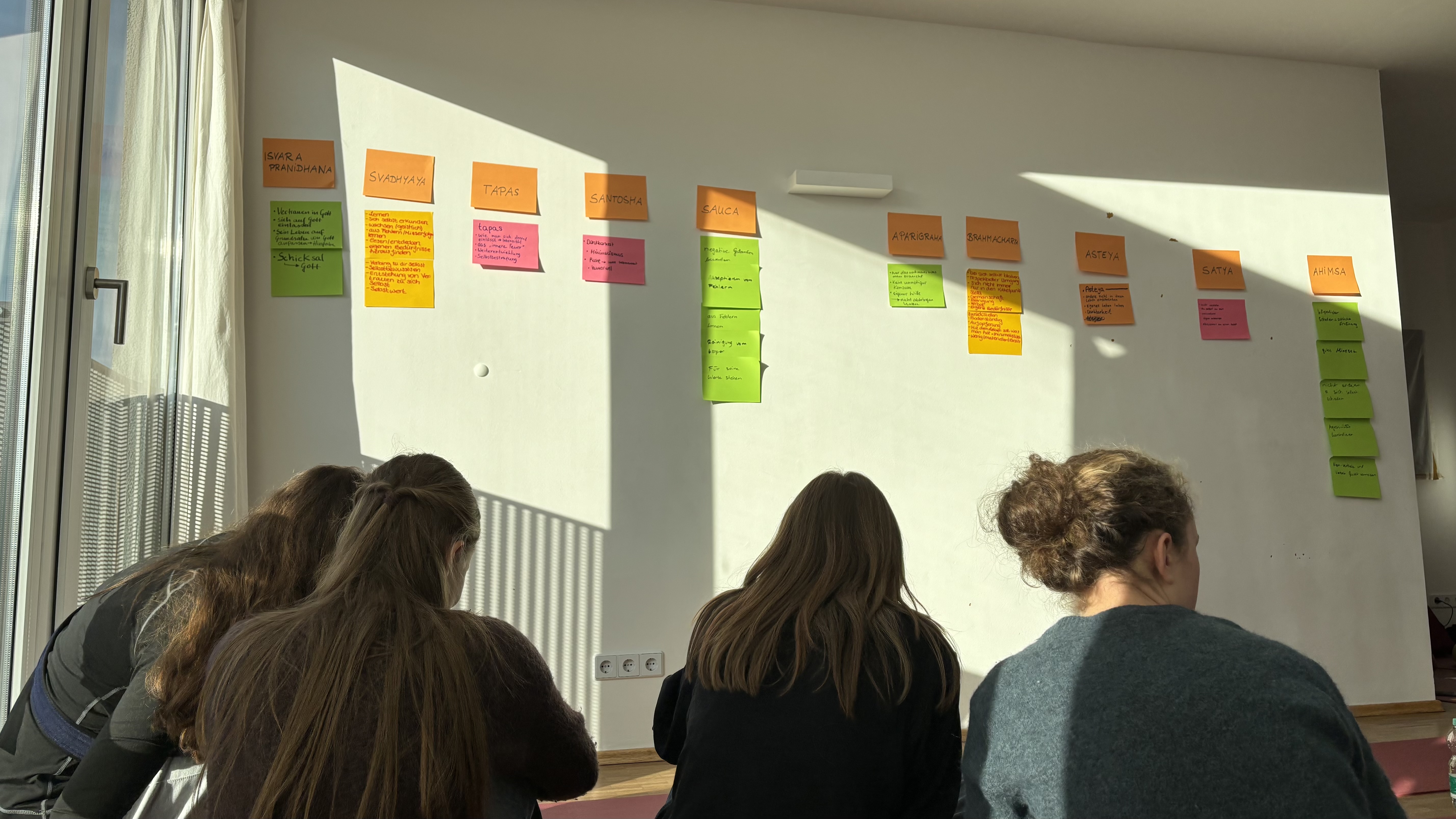 Nach einer kurzen Pause, in der Tee und ein kleiner Snack angeboten wurden, folgte eine Gruppenarbeit zu den Begriffen Yama und Niyama, den ethischen Grundlagen des Yoga. Durch den Austausch in Kleingruppen konnten wir die Inhalte vertiefen und aus unterschiedlichen Perspektiven betrachten.